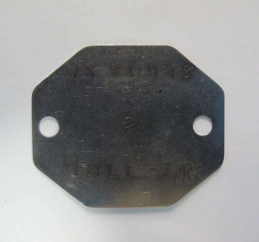 Octagonal identity tag for Col. J. Rex Hall, World War II. Engraved "Vx 80978 P Hall. J. R."