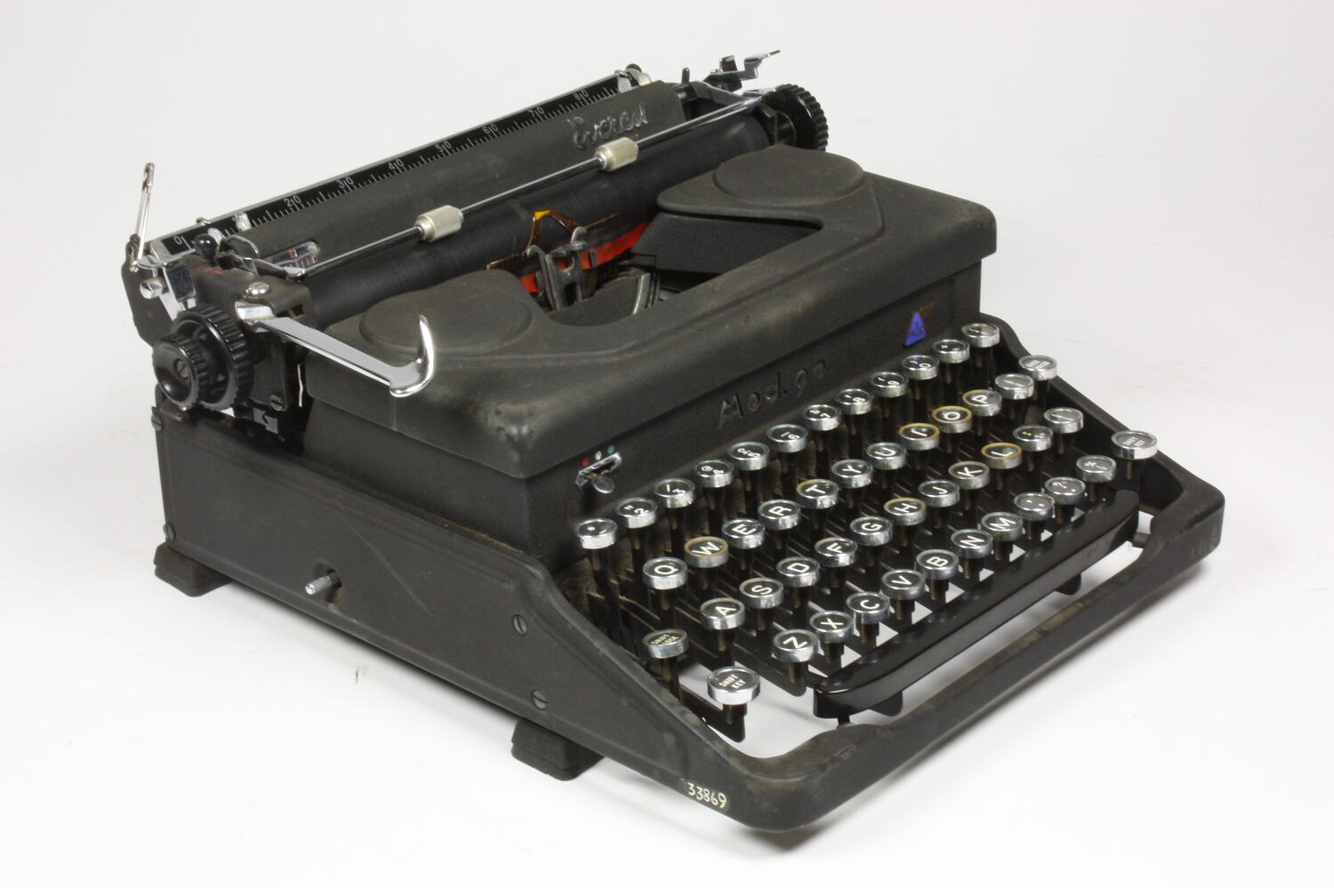 Metal frame with black crackle finish. Cylindrical platen on carriage with black crackle finish and plated metal fittings. 44 typebars in horizontal curved typebasket in front of platen. Inking ribbon carried between two spools on vertical axes. Hinged cover over typebars and ribbon spools. Folding paper guide behind platen. Four-row keyboard with 44 character keys. Additional 'SHIFT / LOCK' and 'SHIFT / KEY' keys to left of keyboard, 'BACK / SPACER' and 'SHIFT / KEY' to right. All keys circular, with white lettering on black background. Spacebar along front of keyboard. Typewriter attached to wooden baseboard of carrying case by two catches on baseboard. Wooden cover fits over machine and attaches to baseboard. Carrying case is covered with black leathercloth.