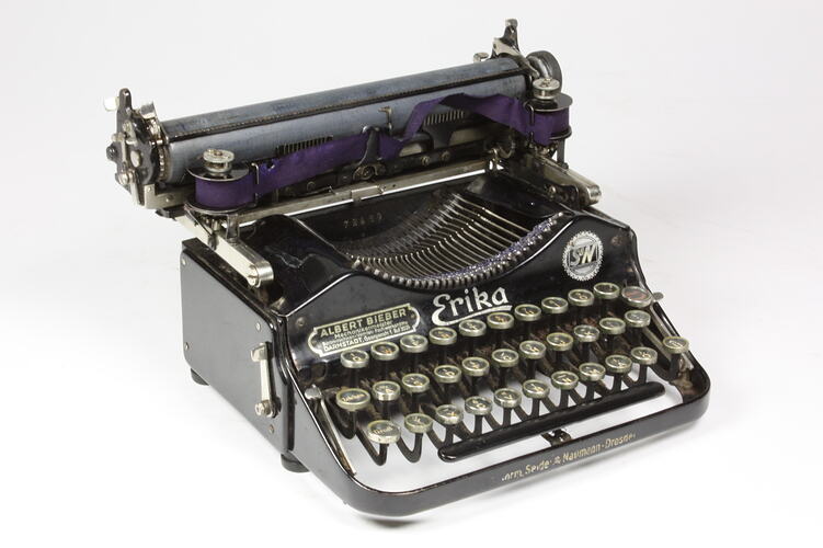 Portable typewriter of the typebar, front strike design, manufactured by Seidel & Naumann of Dresden, Germany. The company was set up in about 1870 and began manufacturing sewing machines and later bicycles. In 1900 the company began production of their 'Ideal' typewriter which was very successful. The 'Erika' portable typewriter, named after the grand-daughter of company founder Bruno Naumann, was introduced in 1910 and the Erika Model 3 was produced between 1923 and 1925.