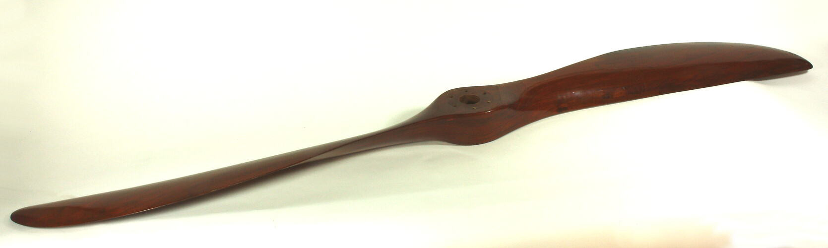 Sculptured double-blade timber aircraft propeller fabricated from laminated Queensland-grown Circassian walnut wood (Juglans regia species) - also known as French walnut, Old English walnut, Persian walnut and Russian walnut. Manufactured by James Moore & Sons, timber merchants, of City Road, South Melbourne for Basil Watson, to be used with the Gnome 'Omega' 50 horsepower rotary aero engine on the Sopwith type single-seat biplane that he constructed in July-October 1916.