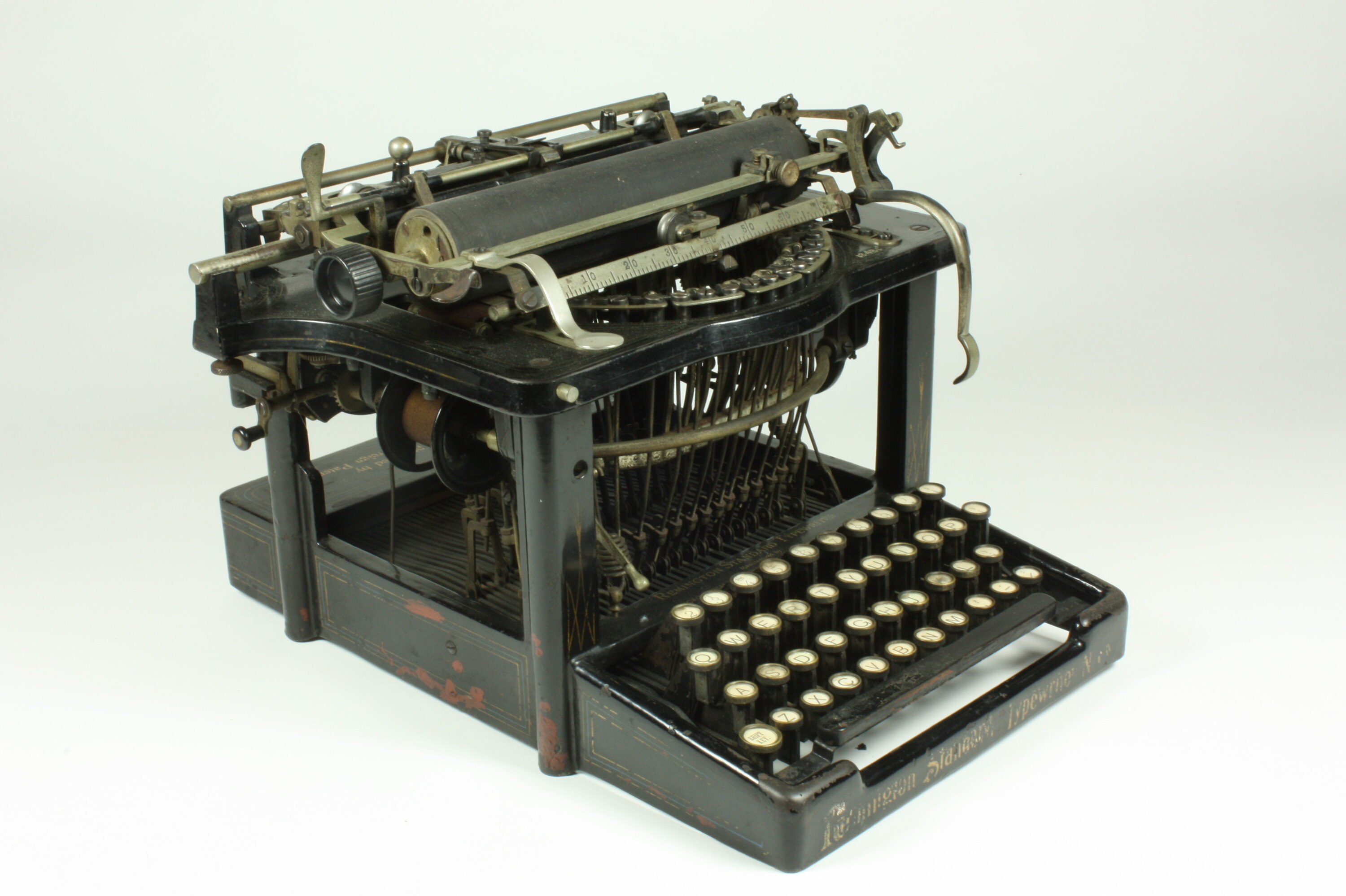 Typewriter of the type-bar upstrike class. It is a Remington Standard No.7, manufactured by Wyckhoff, Seamans & Benedict of Ilion, New York, U.S.A. Remington typewriters were originally made by the Remington Typewriter Company but in 1893 Wyckhoff, Seamans & Benedict obtained sole distribution rights for Remington typewriters and sole manufacturing rights in 1896.