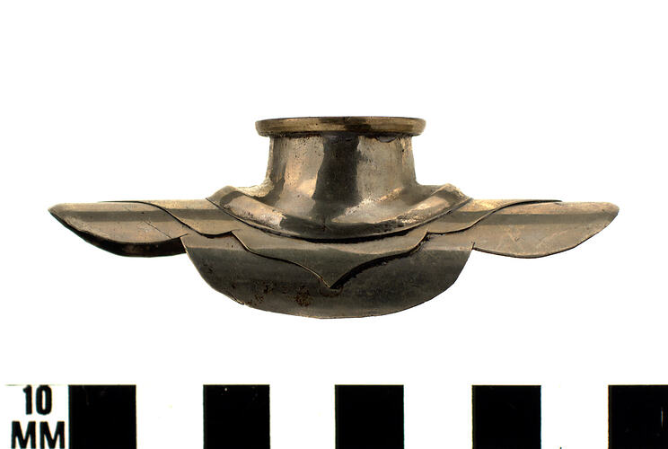 One of a set of seven opium pipe mounts which are part of a group of opium related objects obtained in a raid on Chinese premises by investigating officers from the Victorian Customs Department circa 1905-1930. Opium use was widespread in China between the 17th and 19th Centuries with the British East India Company importing large quantities of the drug. Chinese attempts to ban the opium trade and resistance against the foreign intervention it represented culminated in the Opium Wars of the early to mid-19th Century when force of arms ensured that Chinese ports remained open to opium.
