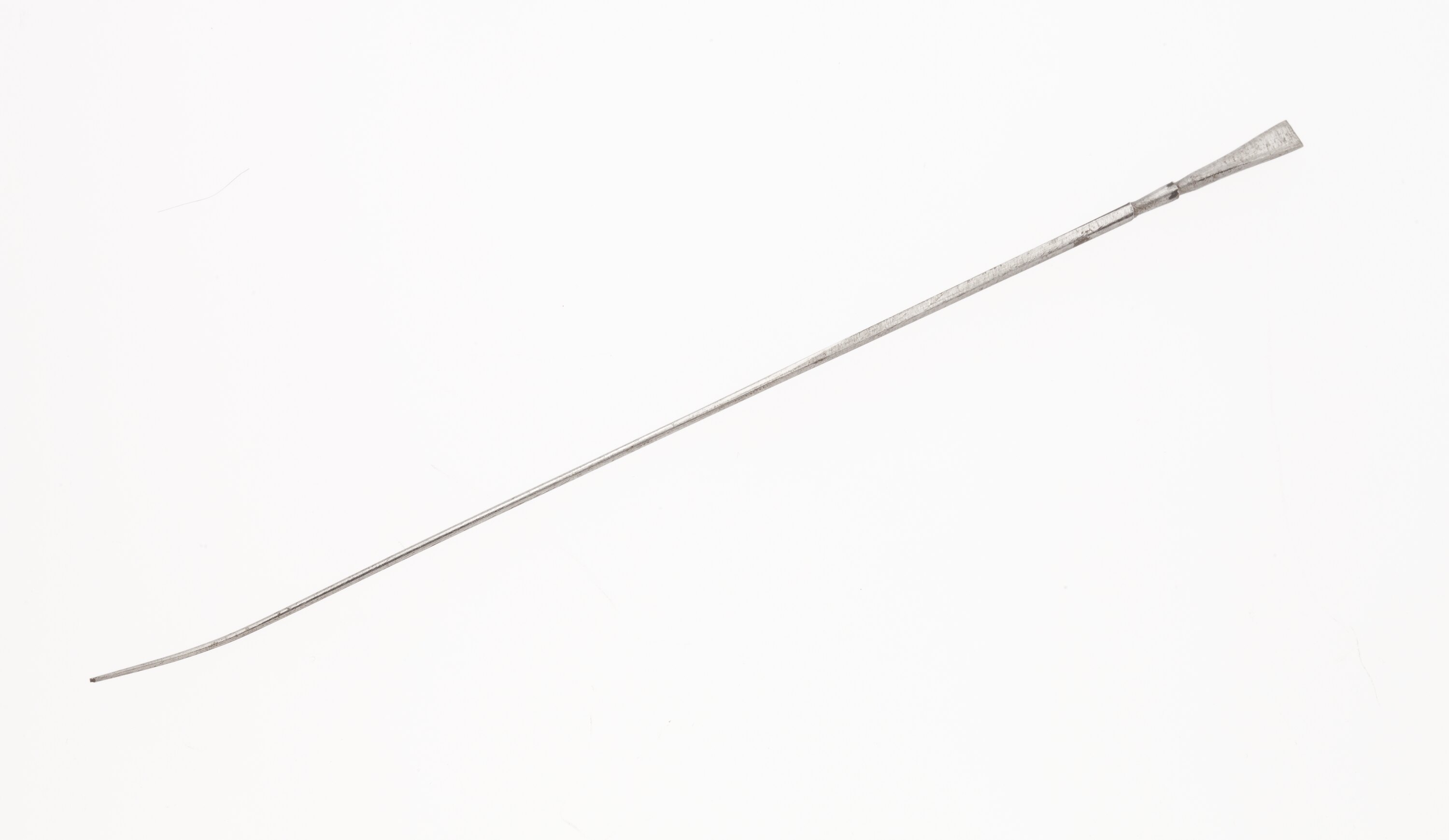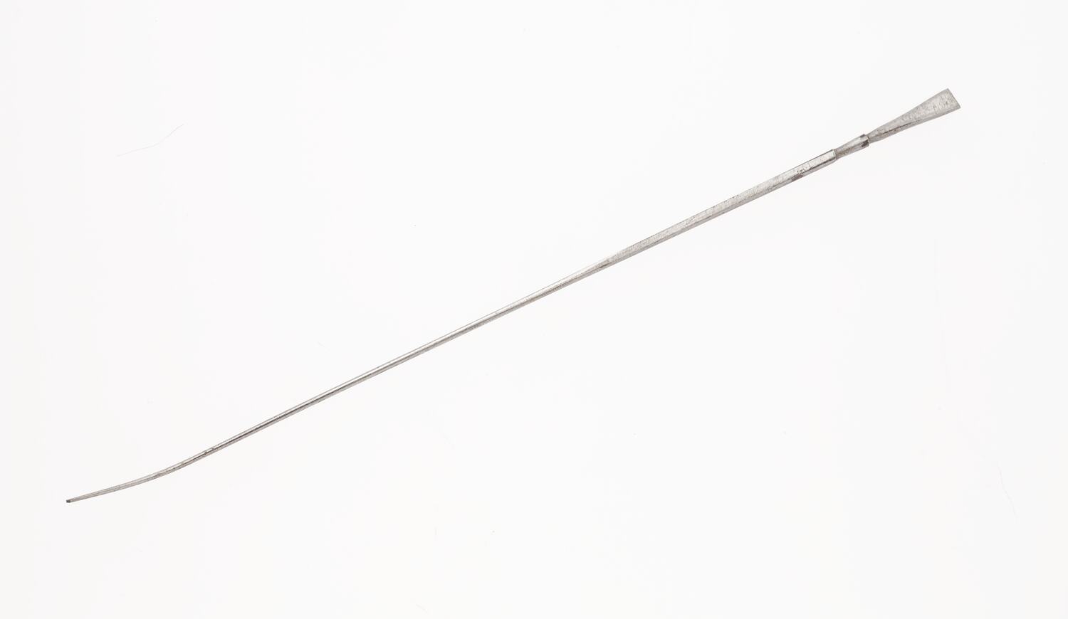 Long thin metal rod which has a flattened triangular shaped section at one end and tappers almost to a point at the other. The end which tappers to a point has a slight curve.