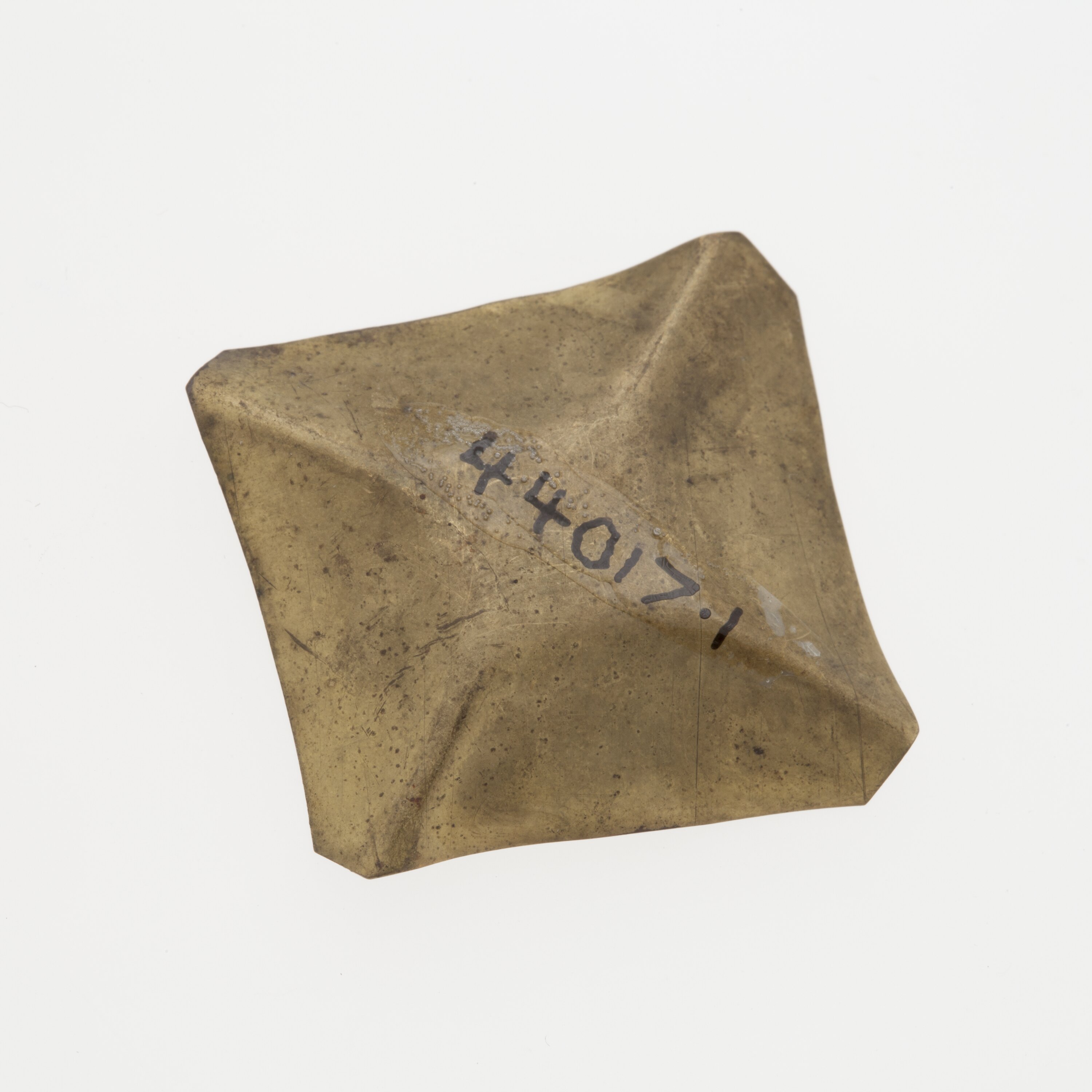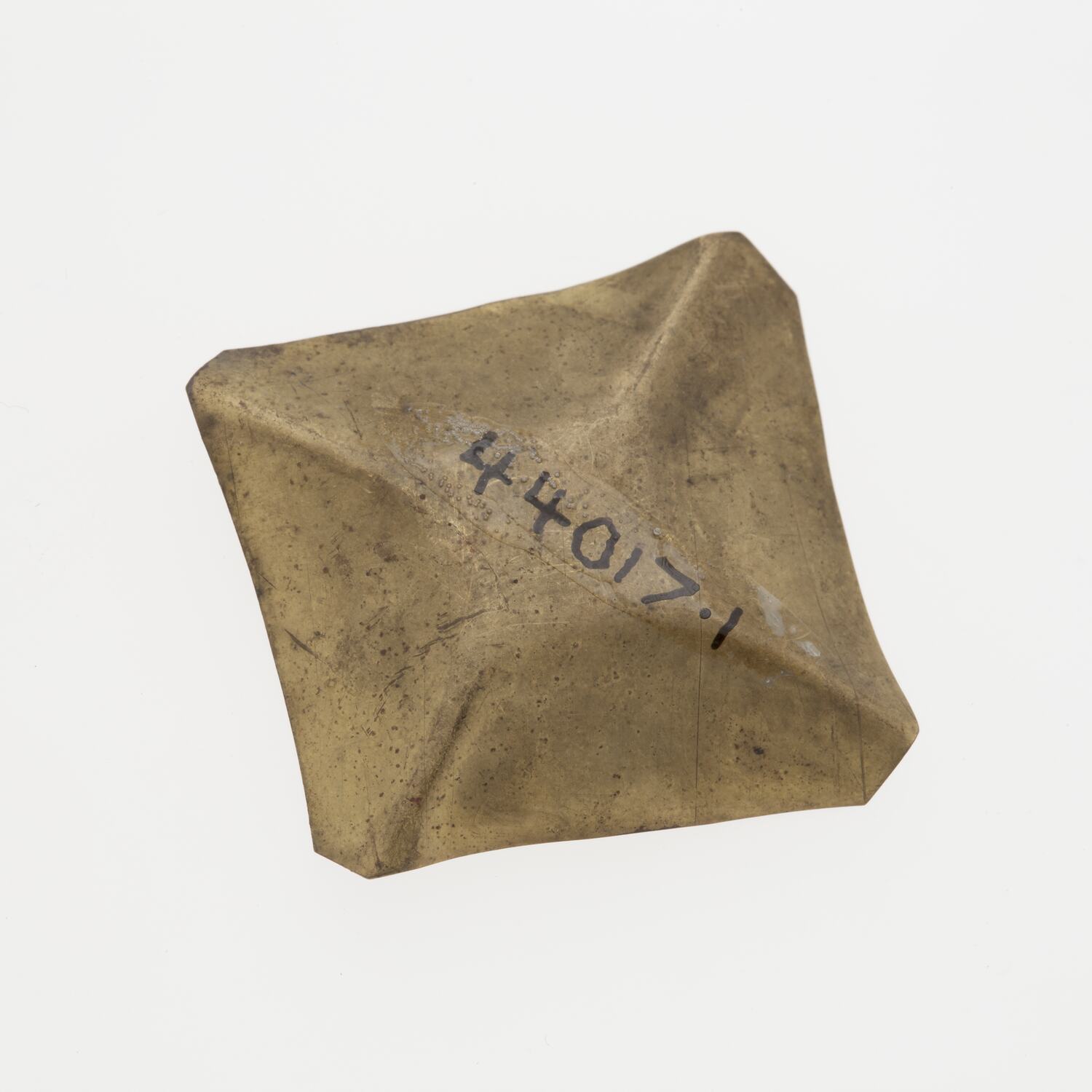 Small square dish made from thin sheet of roughly cut brass. The dish has a shallow square depression in the centre to form a square base.