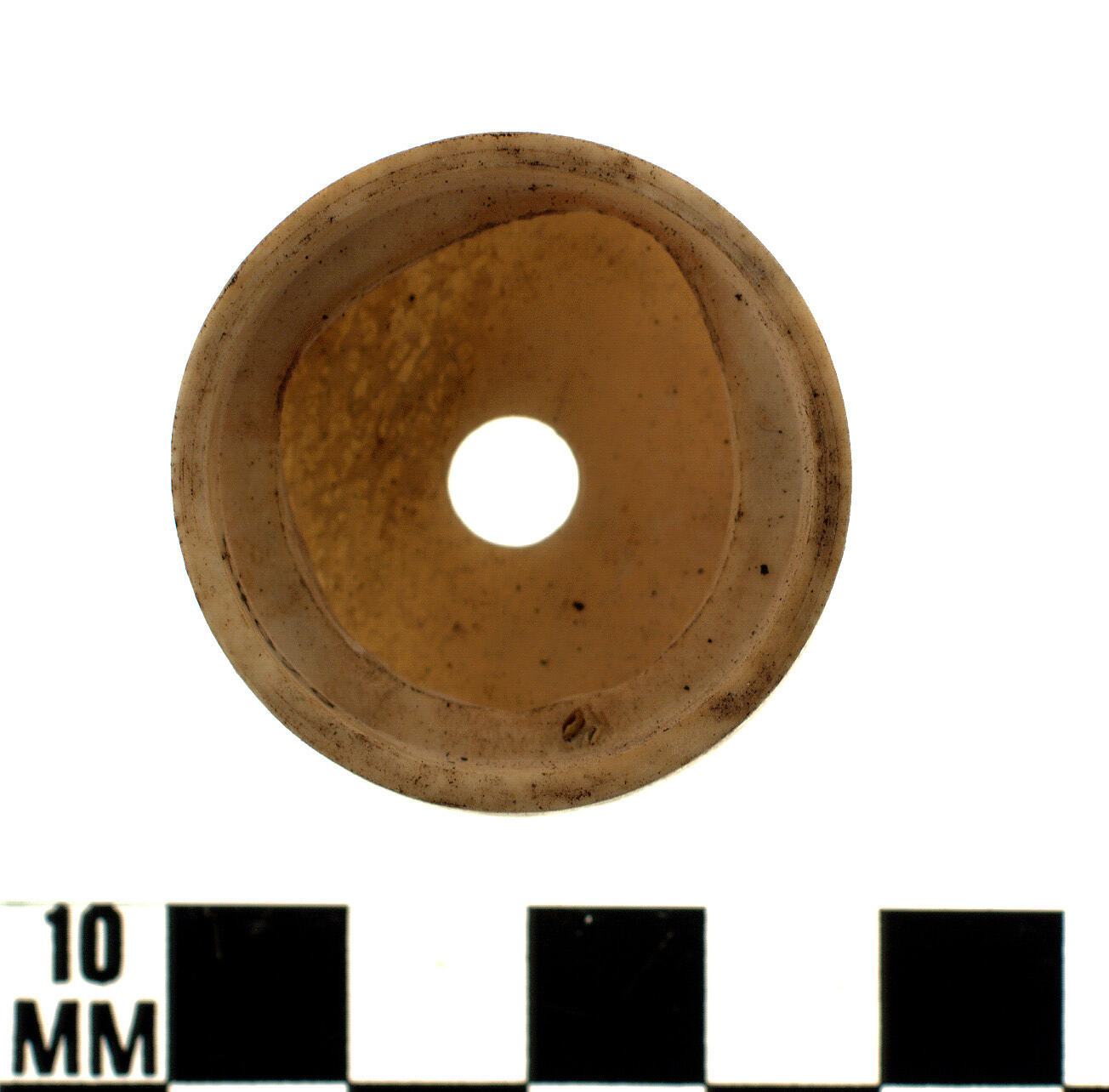 Cylindrical cream coloured object, possibly bone. The object is shallow and hollow with an inner lip and a hole in the centre. It may be a lid or an attachment for an opium related instrument.