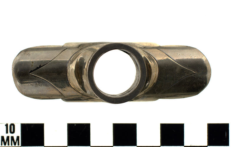 One of a set of seven opium pipe mounts which are part of a group of opium related objects obtained in a raid on Chinese premises by investigating officers from the Victorian Customs Department circa 1905-1930. Opium use was widespread in China between the 17th and 19th Centuries with the British East India Company importing large quantities of the drug. Chinese attempts to ban the opium trade and resistance against the foreign intervention it represented culminated in the Opium Wars of the early to mid-19th Century when force of arms ensured that Chinese ports remained open to opium.