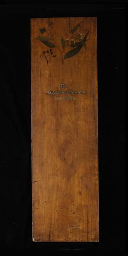 Prepared for exhibition purposes in the Industrial & Technological Museum in 1885. It features a hand painting of the species by Miss May Vale (later Mrs. Gilfillan). Exhibited at the following exhibitions: 1886 Indian and Colonial Exhibition, London; 1887 Jubilee Exhibition, Adelaide; 1888-89 Centennial Exhibition, Melbourne; 1889 Exposition Universelle, Paris.