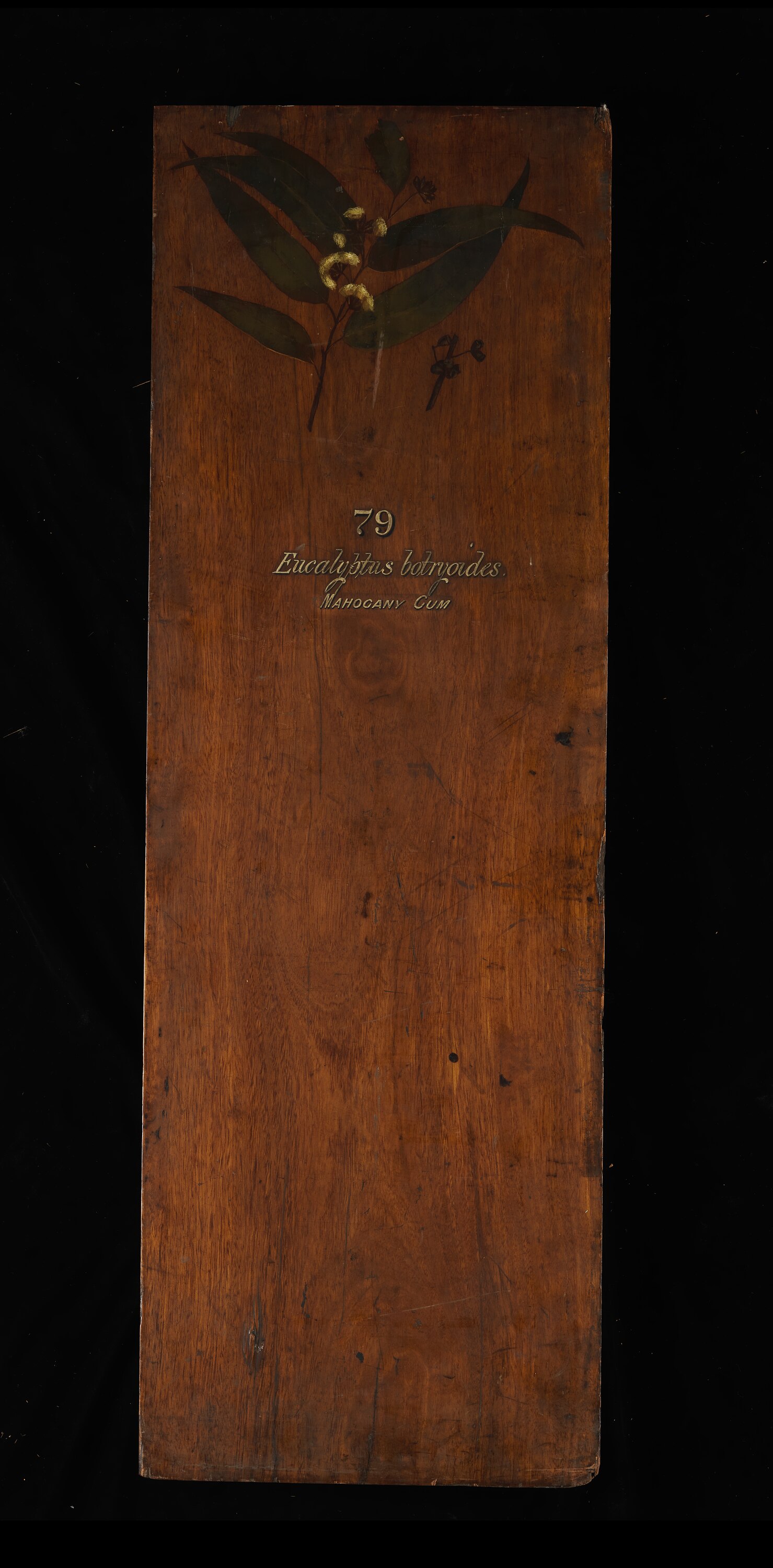 Prepared for exhibition purposes in the Industrial & Technological Museum in 1885. It features a hand painting of the species by Miss May Vale (later Mrs. Gilfillan). Exhibited at the following exhibitions: 1886 Indian and Colonial Exhibition, London; 1887 Jubilee Exhibition, Adelaide; 1888-89 Centennial Exhibition, Melbourne; 1889 Exposition Universelle, Paris.