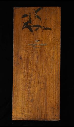 This Timber Sample was prepared for exhibition purposes in the Industrial & Technological Museum in 1885. It features a hand painting of the species by Miss May Vale (later Mrs. Gilfillan). Exhibited at the following exhibitions: 1886 Indian and Colonial Exhibition, London; 1887 Jubilee Exhibition, Adelaide; 1888-89 Centennial Exhibition, Melbourne; 1889 Exposition Universelle, Paris.
