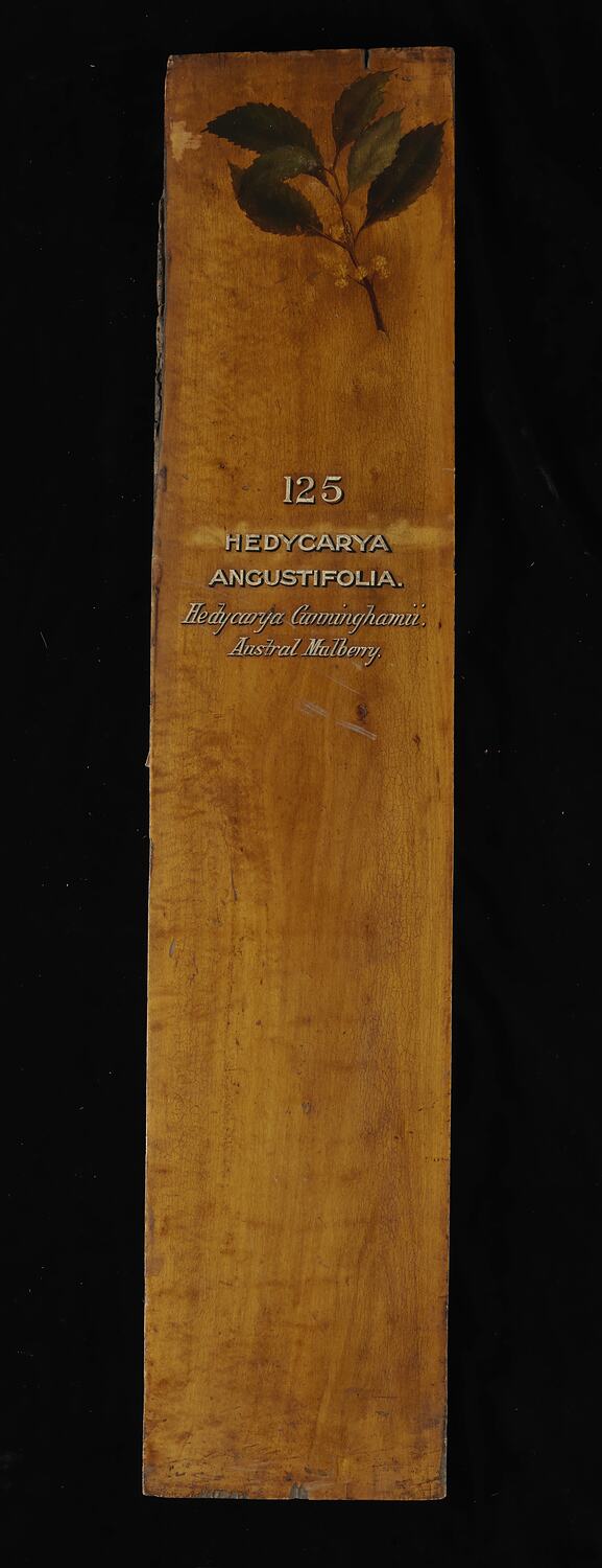 Prepared for exhibition purposes in the Industrial & Technological Museum in 1885. It features a hand painting of the species by Miss May Vale (later Mrs. Gilfillan). Exhibited at the following exhibitions: 1886 Indian and Colonial Exhibition, London; 1887 Jubilee Exhibition, Adelaide; 1888-89 Centennial Exhibition, Melbourne; 1889 Exposition Universelle, Paris.