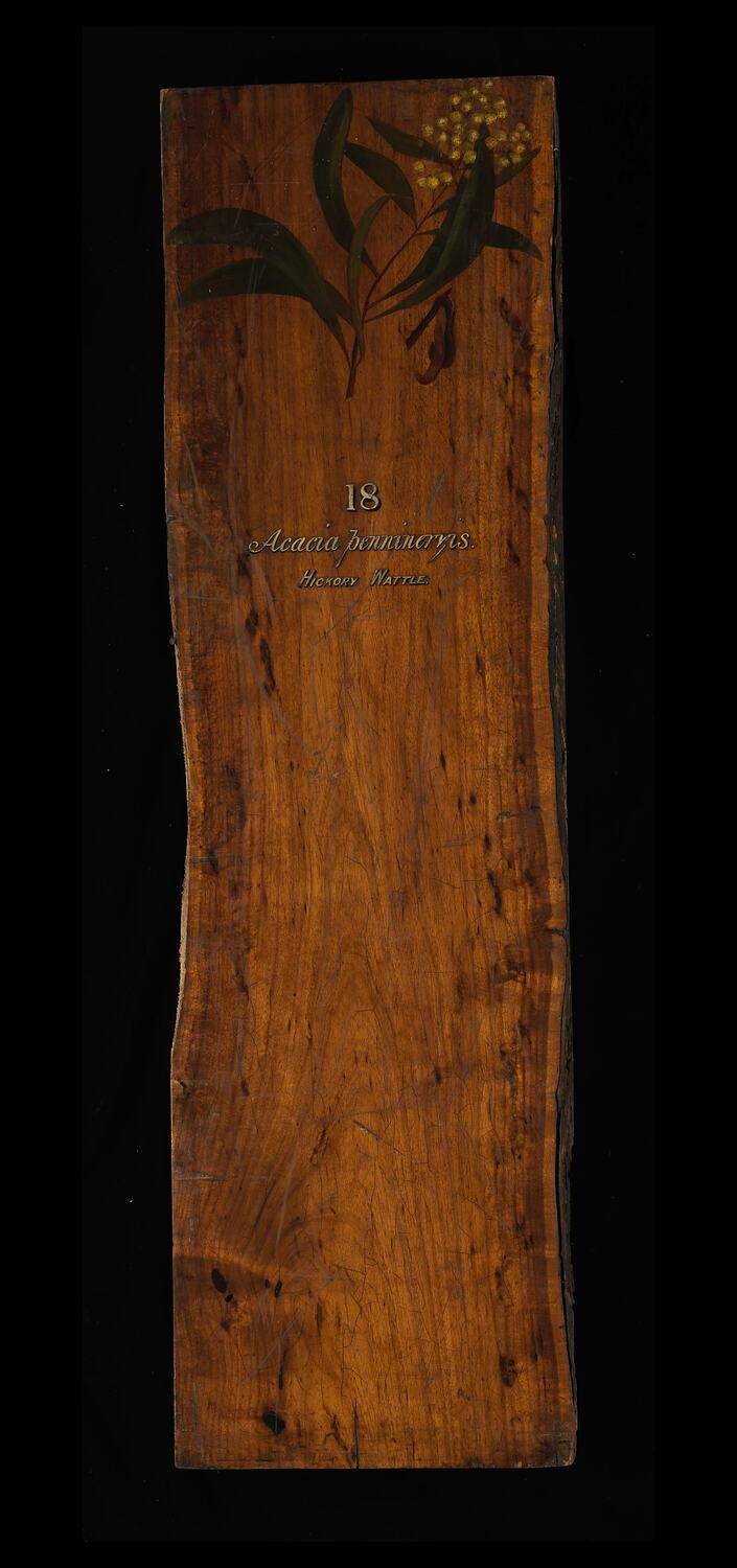 Prepared for exhibition purposes in the Industrial & Technological Museum in 1885. It features a hand painting of the species by Miss May Vale (later Mrs. Gilfillan). Exhibited at the following exhibitions: 1886 Indian and Colonial Exhibition, London; 1887 Jubilee Exhibition, Adelaide; 1888-89 Centennial Exhibition, Melbourne; 1889 Exposition Universelle, Paris.