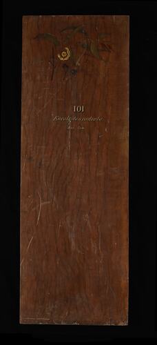 This Timber Sample was prepared for exhibition purposes in the Industrial & Technological Museum in 1885. It features a hand painting of the species by Miss May Vale (later Mrs. Gilfillan). Exhibited at the following exhibitions: 1886 Indian and Colonial Exhibition, London; 1887 Jubilee Exhibition, Adelaide; 1888-89 Centennial Exhibition, Melbourne; 1889 Exposition Universelle, Paris.