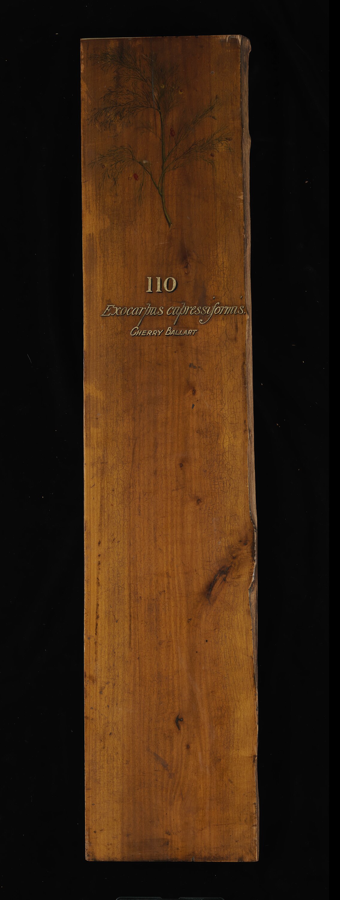 Prepared for exhibition purposes in the Industrial & Technological Museum in 1885. It features a hand painting of the species by Miss May Vale (later Mrs. Gilfillan). Exhibited at the following exhibitions: 1886 Indian and Colonial Exhibition, London; 1887 Jubilee Exhibition, Adelaide; 1888-89 Centennial Exhibition, Melbourne; 1889 Exposition Universelle, Paris.