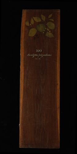 This Timber Sample was prepared for exhibition purposes in the Industrial & Technological Museum in 1885. It features a hand painting of the species by Miss May Vale (later Mrs. Gilfillan). Exhibited at the following exhibitions: 1886 Indian and Colonial Exhibition, London; 1887 Jubilee Exhibition, Adelaide; 1888-89 Centennial Exhibition, Melbourne; 1889 Exposition Universelle, Paris.