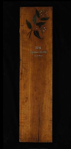 Rectangular sample of wood, planed smooth and varnished on top with hand painted image of a branch with flowers and a branch with seed pods and painted inscription below. There is some remnants of bark on one side. Rear of sample is rough hewn.