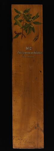 Prepared for exhibition purposes in the Industrial & Technological Museum in 1885. It features a hand painting of the species by Miss May Vale (later Mrs. Gilfillan). Exhibited at the following exhibitions: 1886 Indian and Colonial Exhibition, London; 1887 Jubilee Exhibition, Adelaide; 1888-89 Centennial Exhibition, Melbourne; 1889 Exposition Universelle, Paris.