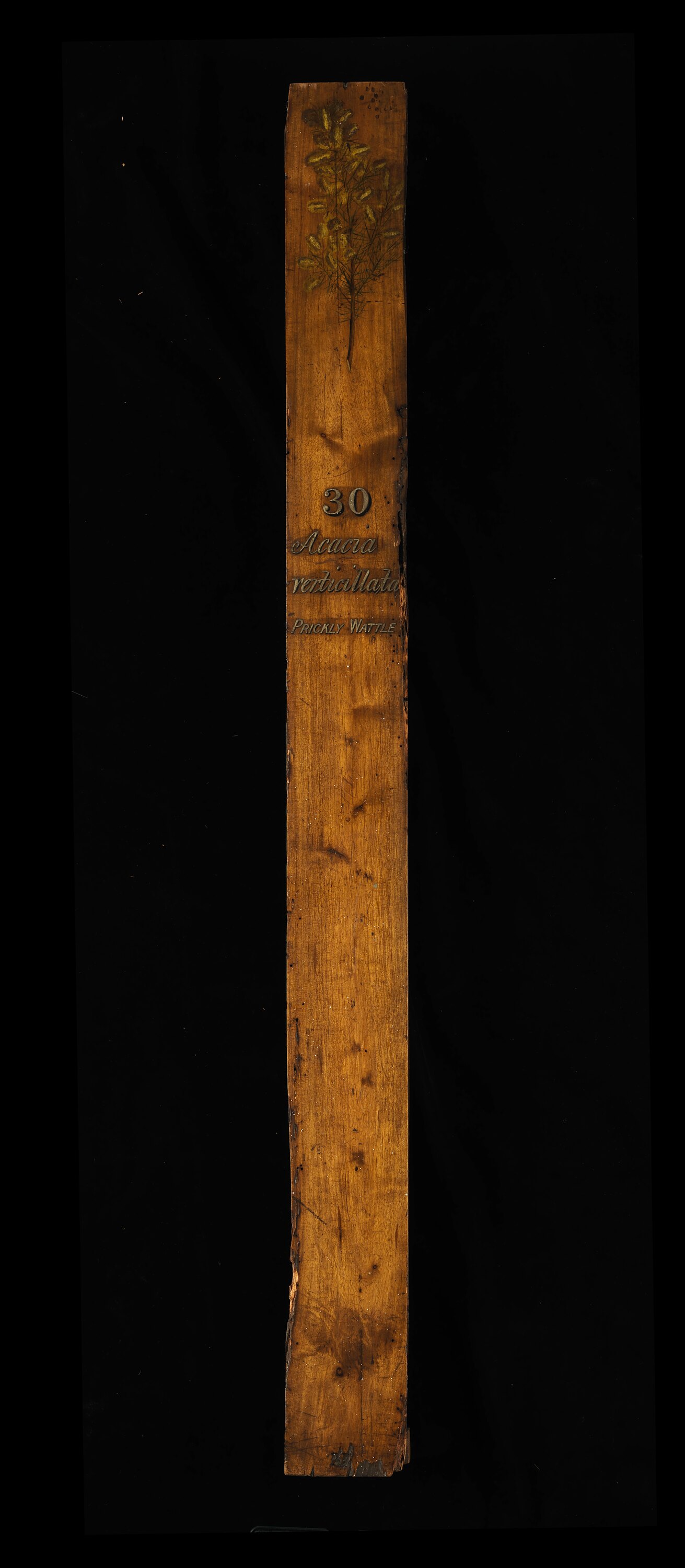 Prepared for exhibition purposes in the Industrial & Technological Museum in 1885. It features a hand painting of the species by Miss May Vale (later Mrs. Gilfillan). Exhibited at the following exhibitions: 1886 Indian and Colonial Exhibition, London; 1887 Jubilee Exhibition, Adelaide; 1888-89 Centennial Exhibition, Melbourne; 1889 Exposition Universelle, Paris.