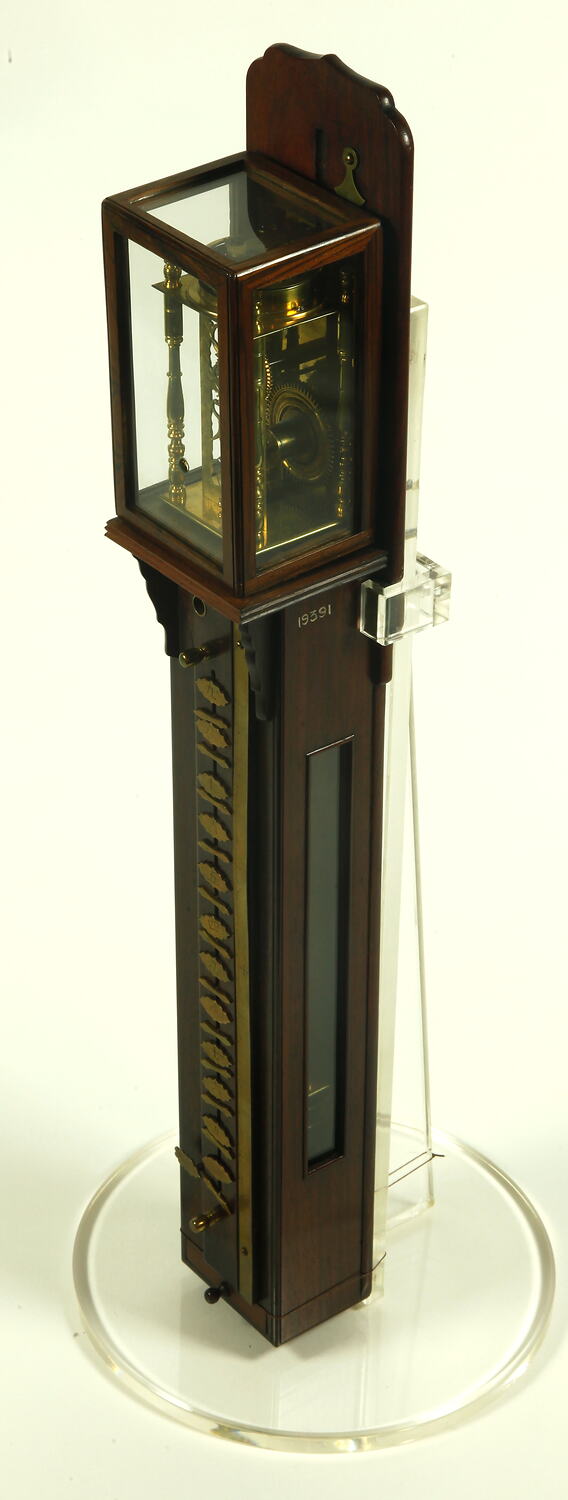 Narrow rectangular wooden case with brass movement at top under glass cover. Drawer at base for key. Calibrated brass strip runs vertically. Weight driven; verge escapement.