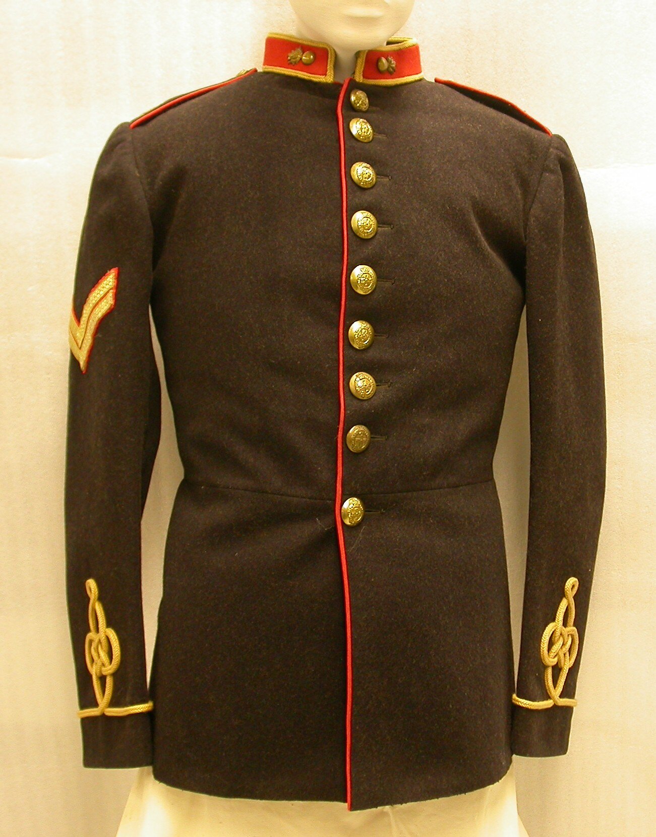 Black wool; red piping down front and edge of back panel, and the edge of cloth epaulettes. Stand collar with red broadcloth, edged with yellow silk braid, and exploding grenade badges. Nine brass Victorian Military Forces buttons made by Beckworths Ltd, London down front, and two buttons on epaulettes at neck edge. Eight buttons on skirt at back, made by H. W. Martin, London. Chevron of gold and red brocade on right sleeve above yellow silk braid. Gilt letters on shoulders. Black sateen lining.