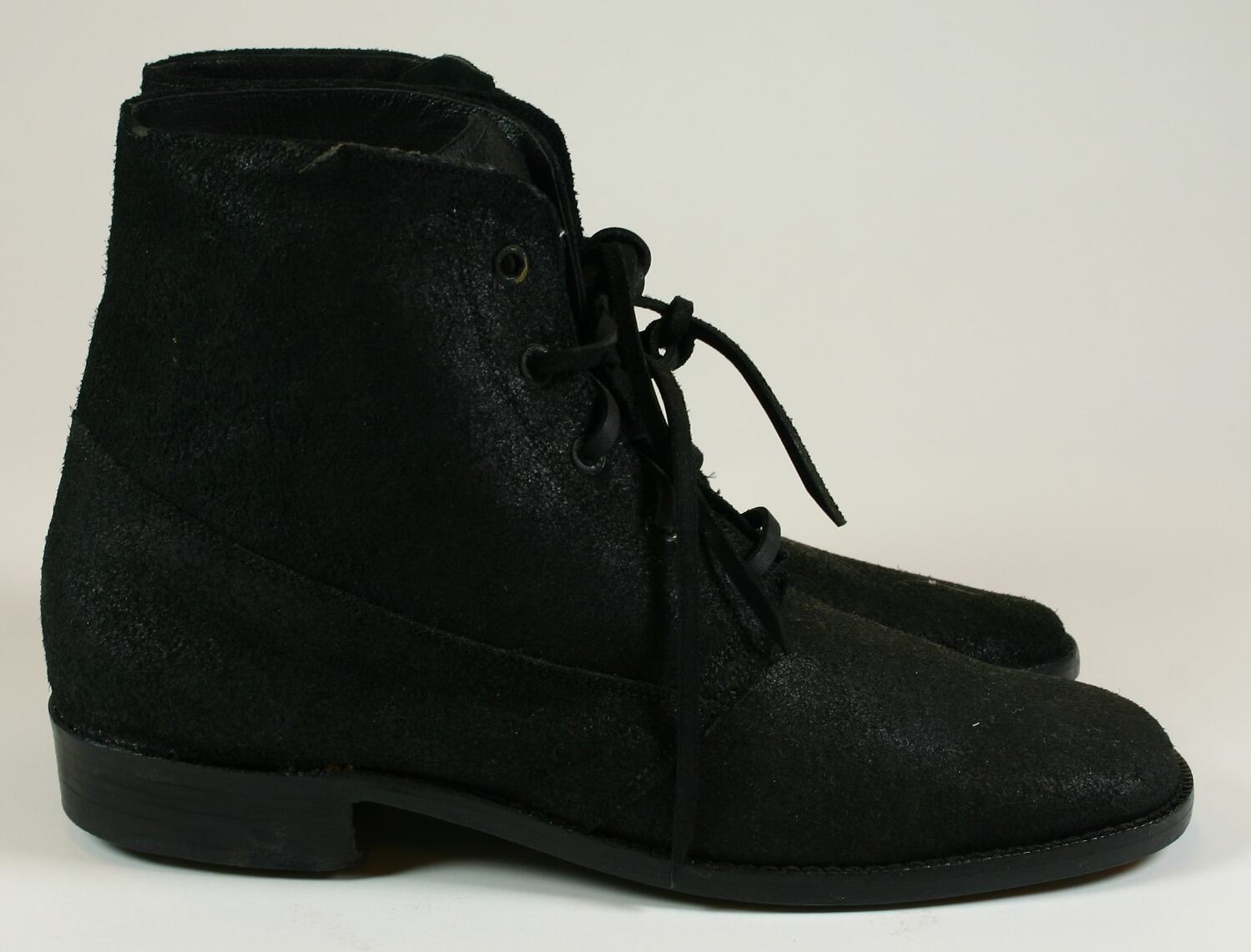 Black five-hole, lace up, suede leather, ankle boot. Right foot. Leather sole. Hob nails around edge of heel.