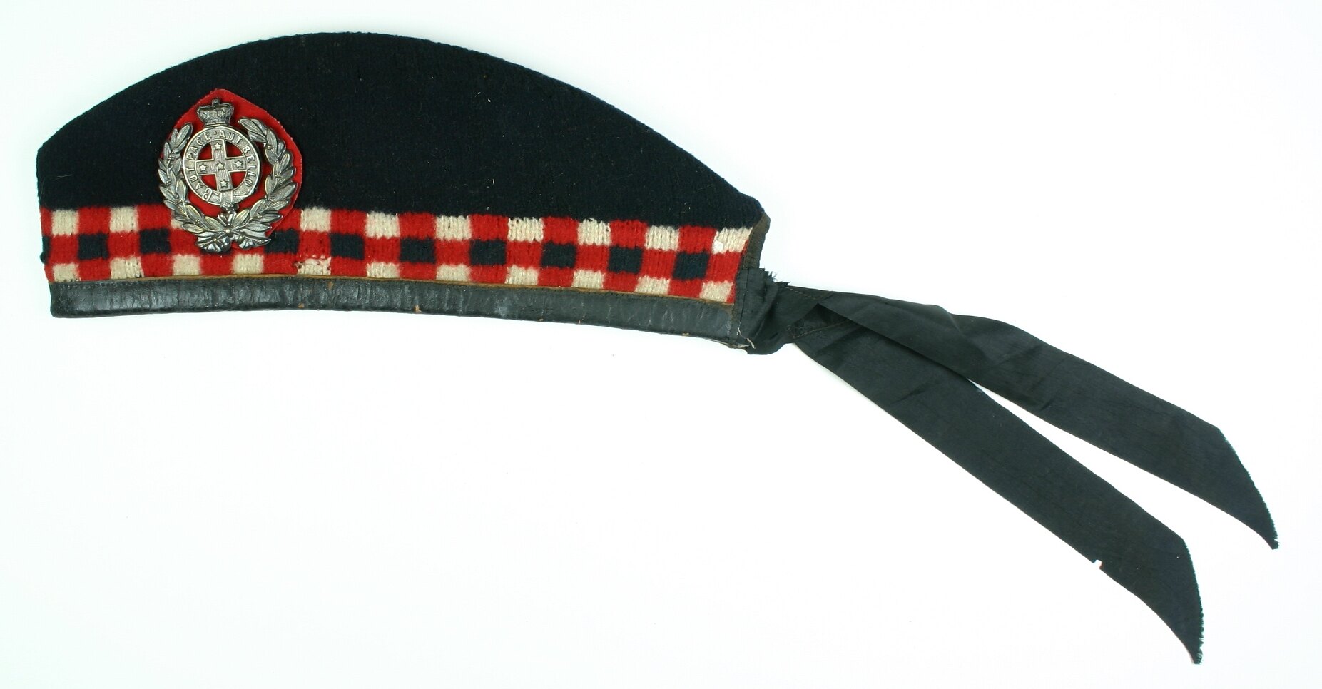 Black glengarry with tartan band and regimental badge.