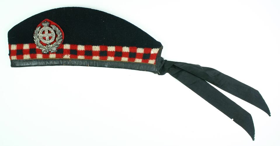 Black glentarry with red, black and white tartan band. Red toorie [pom pom, bobble] on crown. Regimental badge on proper front left.