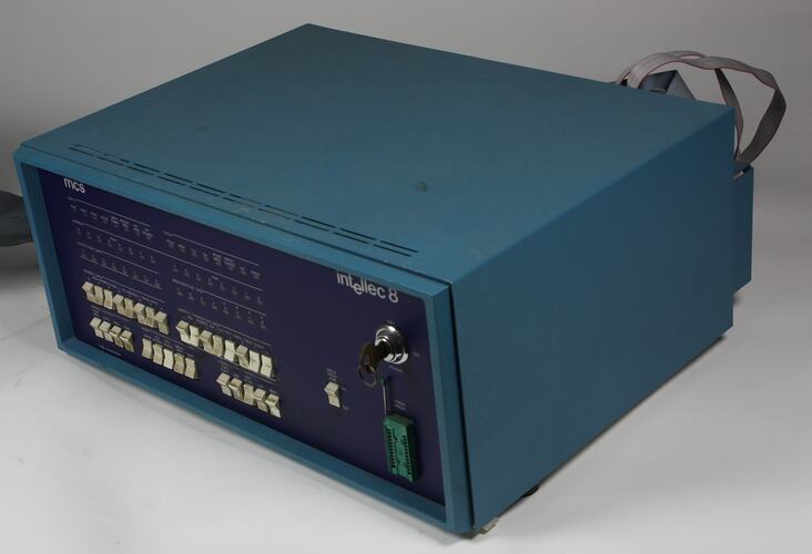 * CPU Unit: Rectangular box with blue covers and black front and rear panels. Front panel has two rows of switches and three rwos of lights for setting and observing the status of the system. Key switch one front left corner acts as the power switch. Below is green ZIF (zero insertion force) integrated circuit socket for installation of an EPROM memory device to be programmed. Rear has multiple flat grey ribbon cables emerging, some of which are permantly attached to the disk drive unit, and others destined for the memory box. Cooling fan located in the centre of the rear panel. * Memory Box: Light blue rectangular box, with power switch, power indicator and locking latch on front panel. Rear panel has cooling fan centrally located and power cable emerging from the left corner. Piano hinge joins the top panel to the top of the rear pane for access to the internals. Slot along the bottom of the rear panel allows the connection of data cables to the CPU unit. * Floppy Disk Drive Unit: Blue rectangular box with natural aluminium front panel and black rear panel. Front panel two has 8-inch floppy disk drives mounted to the left, and power switch in the top right corner. Rear panel has two cooling fans mounted to the left and right and fuse holder in the centre with flat grey data cables emerging from a slot located along the top. Lower disk drive has CPM disk loaded.