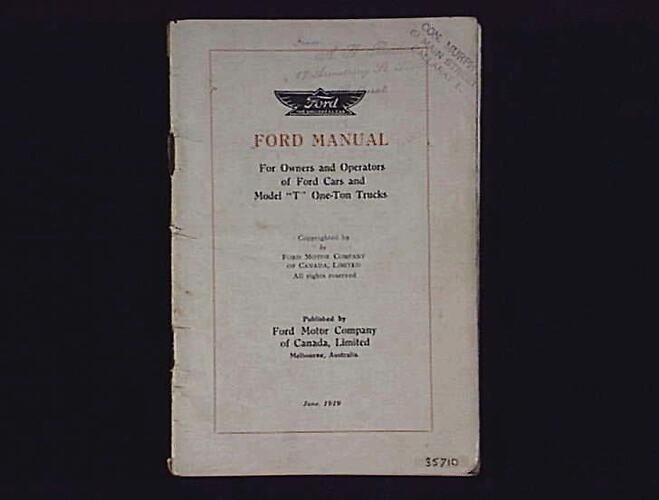 Instruction book for Ford Model T cars and one-ton trucks dated June 1919. Published by the Ford Motor Co. of Canada Ltd., Melbourne, Australia.