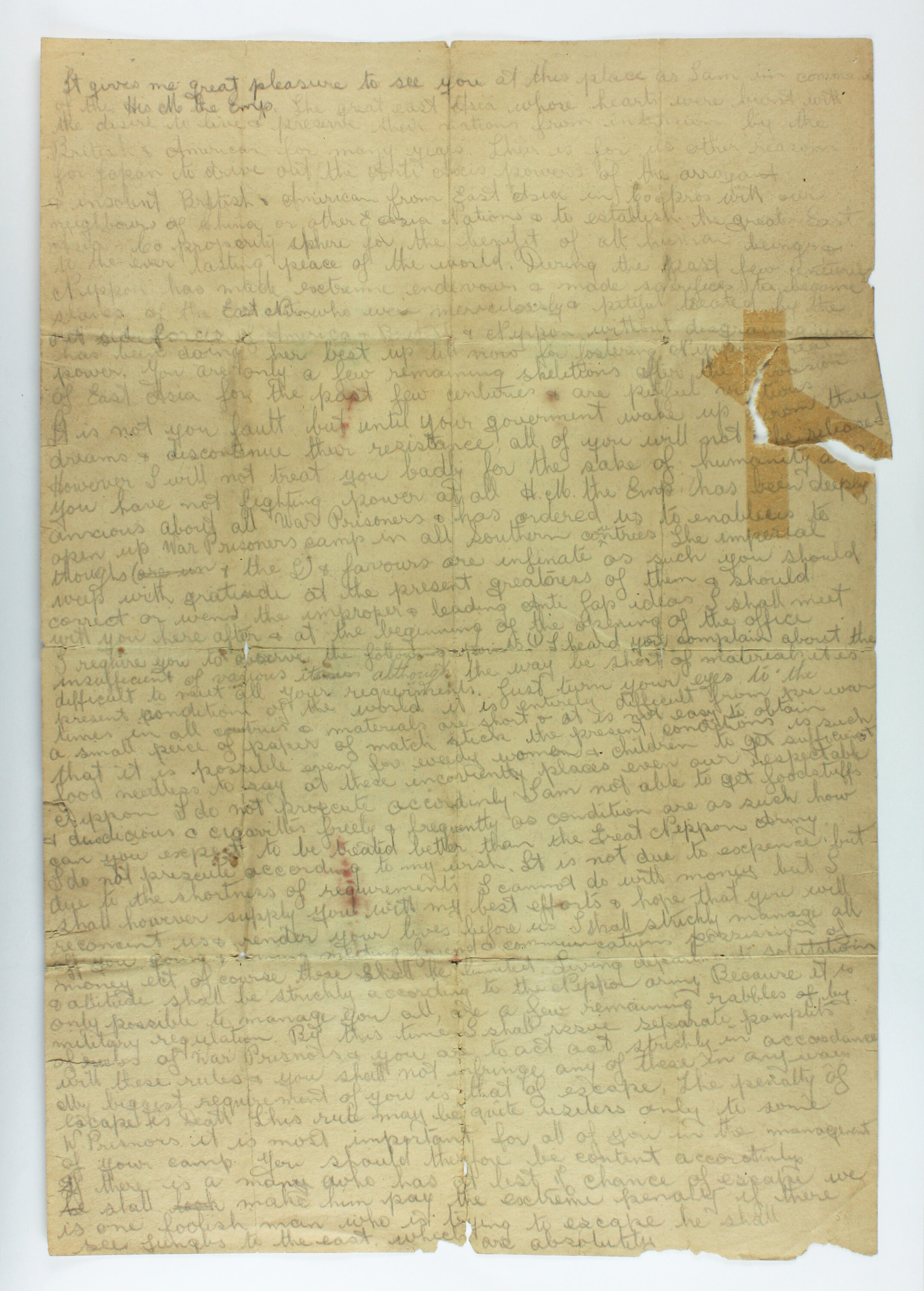 Hand-written copy of an address delivered by Lieut. Colonel Y. Nagataro, Chief of the 3rd Branch of Thai war prisoners camp, Thanbyazayat, to prisoners of war. The speech was delivered at the opening of the POW camp at Thanbyazayat on 15 September 1942. The copy was written by Rohan Rivett, who asked Mr Clarke, a fellow POW, to hide the speech until after the war. Clarke managed this by rolling the paper inside the bamboo frame of his bed in the POW camp.