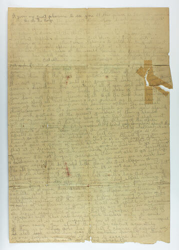 Single sheet of paper, extensively hand-written in pencil on both sides. The paper is very yellowed and worn, with torn edges and a larger tear in the upper right side that had been repaired with adhesive tape which has left a residue.