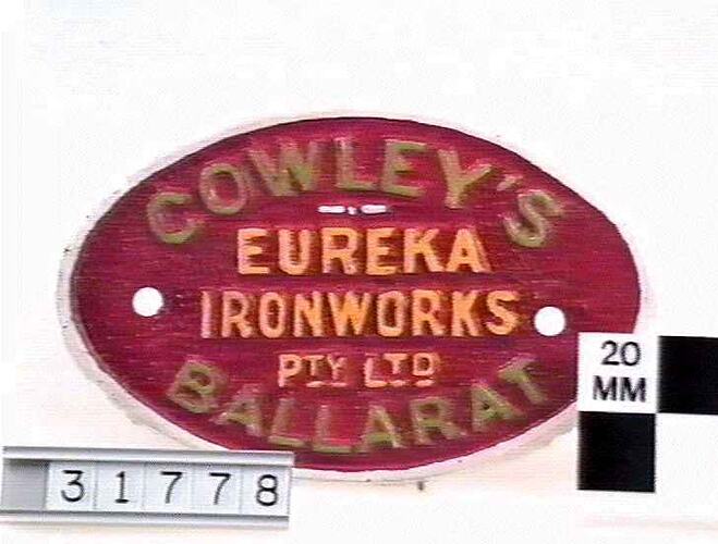 Front: "COWLEY'S / EUREKA / IRONWORKS / PTY LTD / BALLARAT "