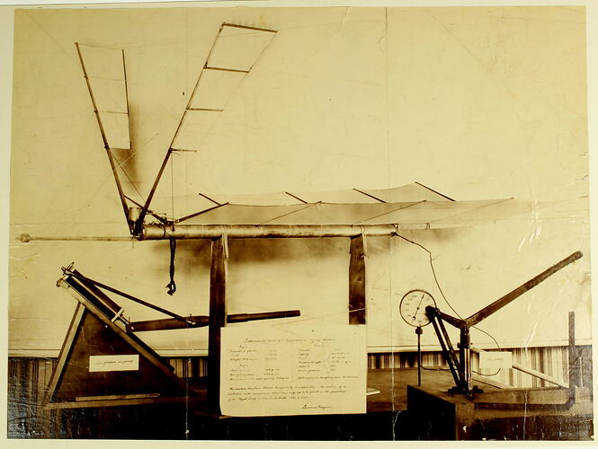 Large photographic print of an experimental powered aeroplane model built by Lawrence Hargrave.