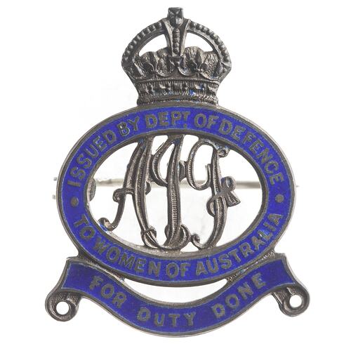 Badge made from silver and decorated with blue enamel. A blue enamel circle surrounds the voided word 'AIF' and is inscribed with the words 'ISSUED BY DEPT OF DEFENCE TO WOMEN OF AUSTRALIA'. Beneath the oval is a scroll inscribed 'FOR DUTY DONE' and the oval is surmounted by a crown.