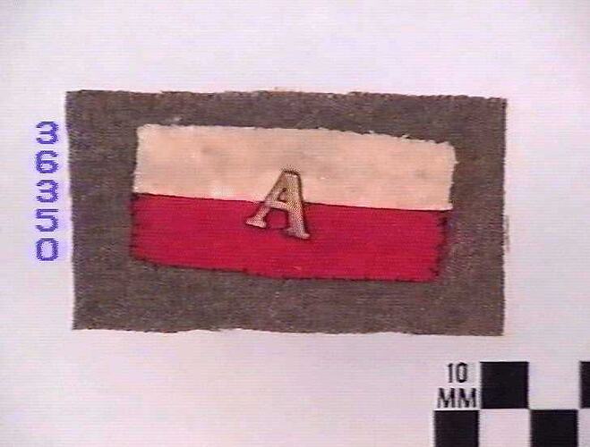 Rectangular colour patch, white over red with brass 'A' in centre. Sewn on piece of khaki serge (part of sleeve).