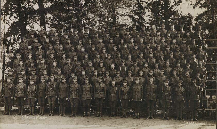 Group portrait of Australian servicemen of the 2nd Reinforcements, 57th Battalion, A. I. F., circa 1916.