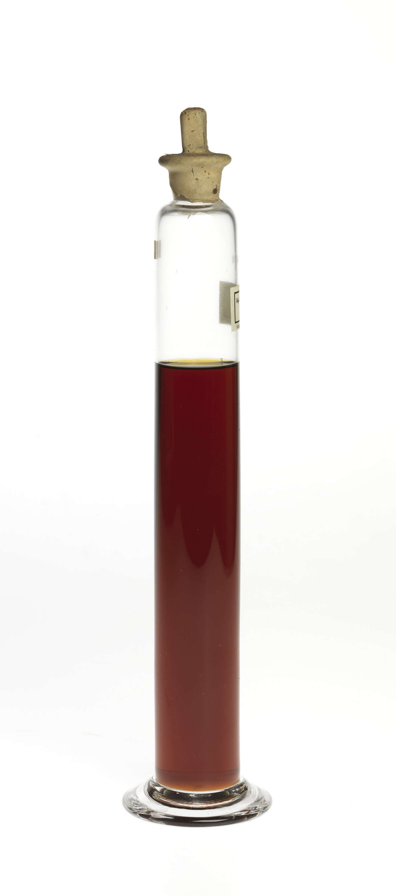 Oil sample in cylindrical glass jar with stopper and label.