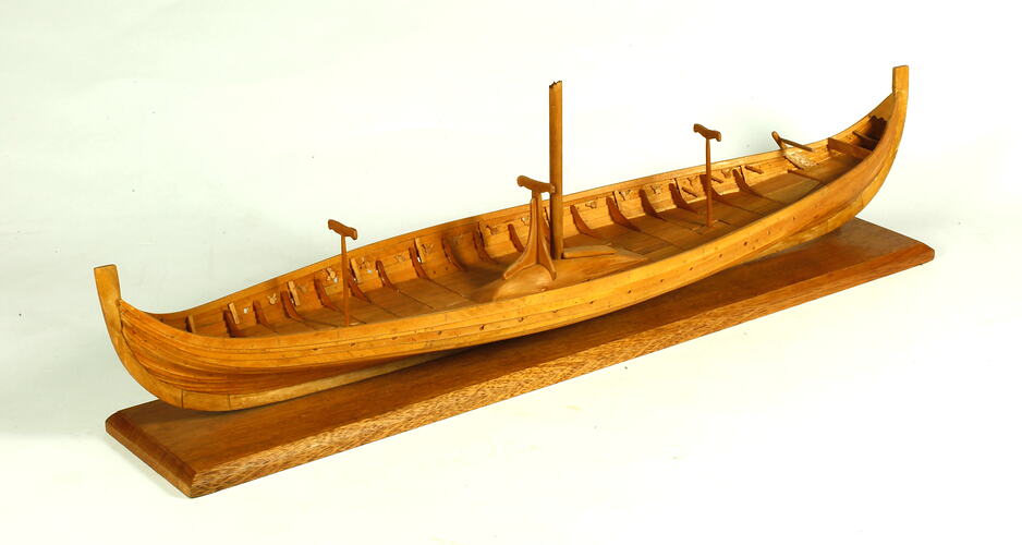 The model was made by S.F. Anderson, of Maryborough, Victoria, and was one of two models he entered in the Science Museum of Victoria's 1970 centenary model-making competition, with the other being a similar style natural wood finish model of a 12-Gun Brig of War (ST 034709). Both models were subsequently purchased by the Museum, with the Brig of War model acquired in 1970, and the Viking Burial Ship model in September 1971.