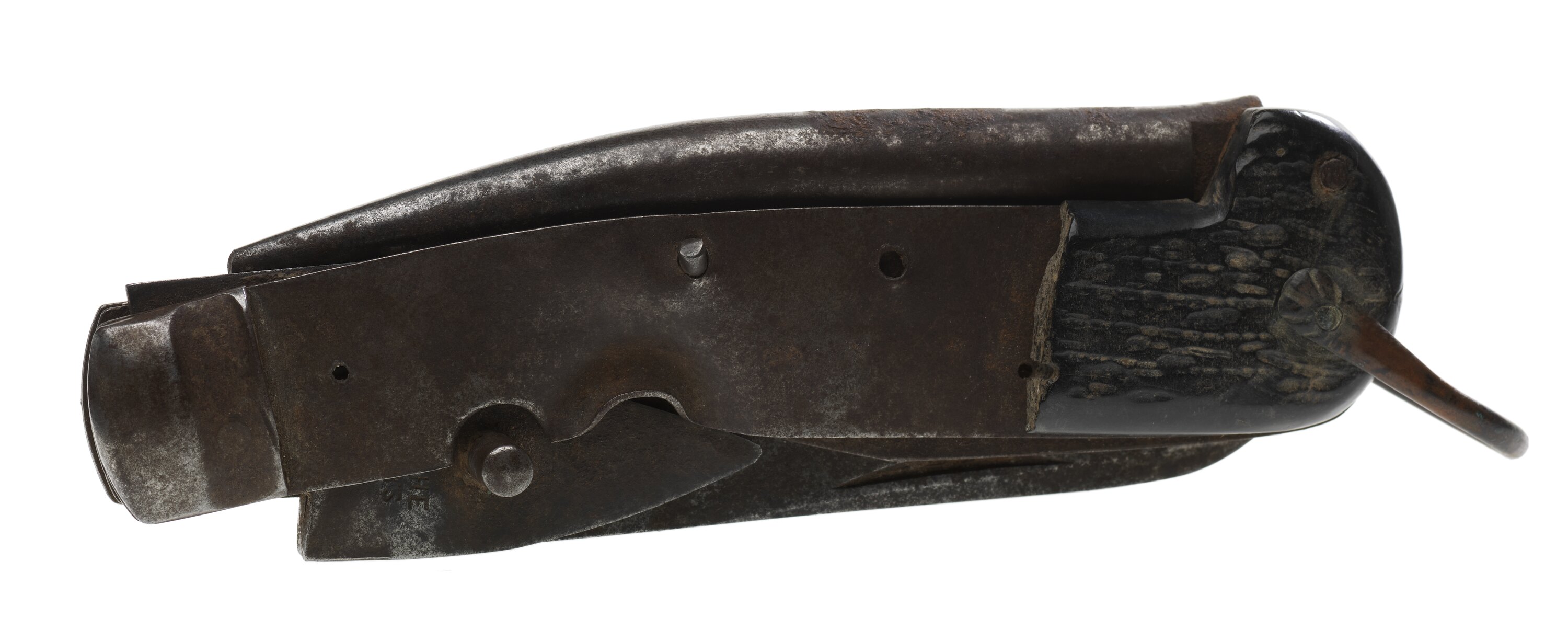 Knife has blade and two implements for removing stones from horses' hooves. Black composition grips - one side broken where hit by bullet.