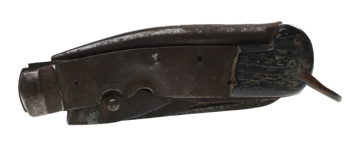 World War I army G.P. clasp knife with a deflection mark from ball shrapnel or a bullet. Its owner was Corporal Cousland of the 22nd Battalion, service # 3808, A.I.F. His life was said to have been saved by the knife in France. A knife like this was usually carried on a belt, but he decided to carry it in his top pocket, where he was struck.