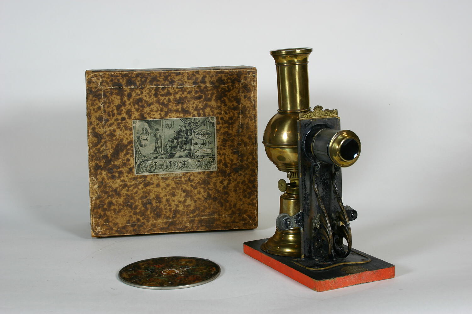 Brass spherical body, incorporating a single wick illuminant controlled by brass nut. The projection barrel is composed of tin, while the lens is encased in a brass housing. A decorative slide holder of blackened tin takes circular slides, typically made up of six individual pictures. Gold coloured trim is a feature, with the slide holder exhibiting a pressed metal decoration incorporating the manufacturer's logo of a winged wheel above the initials E.P. The projector and slides are housed in a covered wooden box, featuring a pasted picture of a domestic lantern show, with the manufacturer's logo in the right upper corner and the words 'Laterna Magica'.