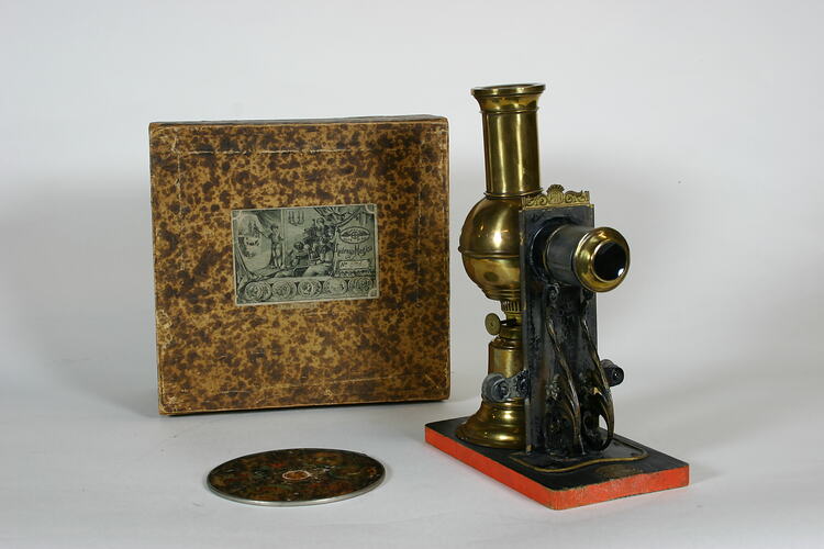 Children's toy magic lantern projector, designed for domestic use with circular glass slides. Includes box and two circular slides. The 'Brass Climax' was a special variant of the 'Climax' model and was produced specifically for the British and United States markets. The body is of polished brass and uses a single wick kerosene burner as an illuminant. The ornate slide holder is of die pressed metal and incorporates the company logo (wings on either side of a four-spoked wheel and the initials E.P.).