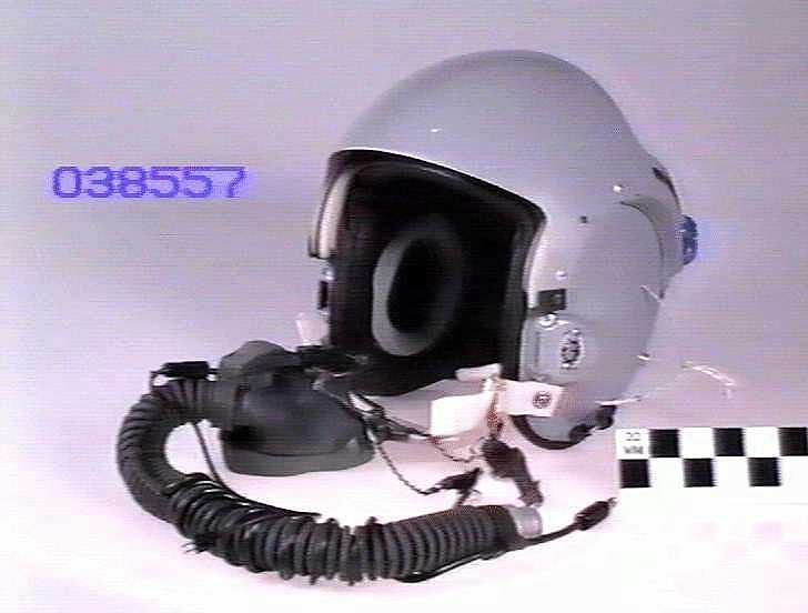 HGU-26/P military flying helmet manufactured by the Sierra Engineering Co., California, USA. Consists of a fibreglass shell, styrofoam inner liner, pad, earcups, chin-strap and visor assembly. Formerly used by the Royal Australian Air Force (RAAF). Part No. 345-301, (Federal Stock No.) FSN 1660-440-5553.