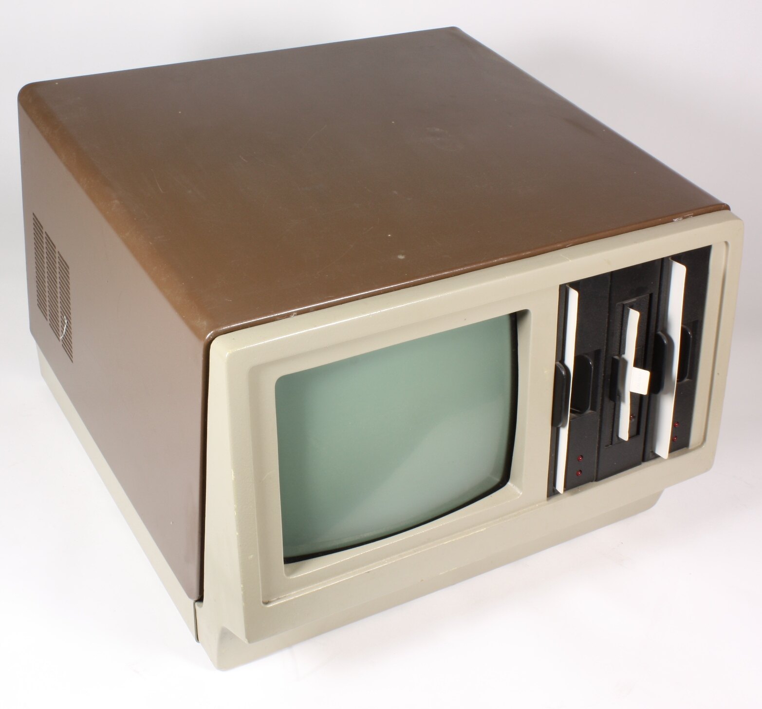 The computer is accompanied by disks and manuals. The computer itself is an integrated unit with screen, two 8" and 5¼ diskette drives in brown and beige single casing. Transport protection cards in each drive.