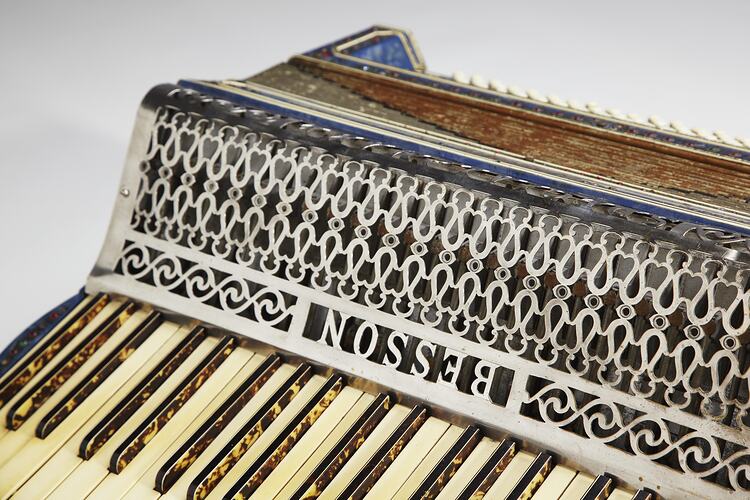 Piano Accordion with blue laminex finish and nickelled metal grill work. It has a 3 octave keyboard and 120 brass buttons. Two rows of brass buttons give bass notes arranged in cyclic order of tonalities (D, G, C, F, etc), one row being offset against the other at the interval of a major third for convenience in fingering melodic passages in the bass. The other rows give 3-note chords, respectively, major and minor triads and dominant and diminished sevenths.