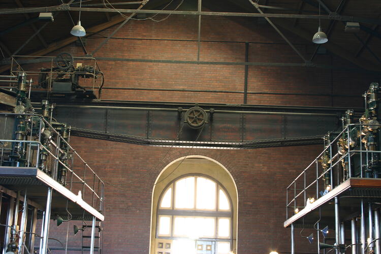 Double girder 55-ft (16.76 m) span overhead travelling crane located in the North Engine Room, built by Thompson & Co., Castlemaine, circa 1894, as part of the original equipment supplied by the firm for the Spotswood Sewerage Pumping Station. The crane was originally fully manually operated, but was later converted with a compressed air driven winch for lifting, retaining the manual gear for traversing & traversing only.