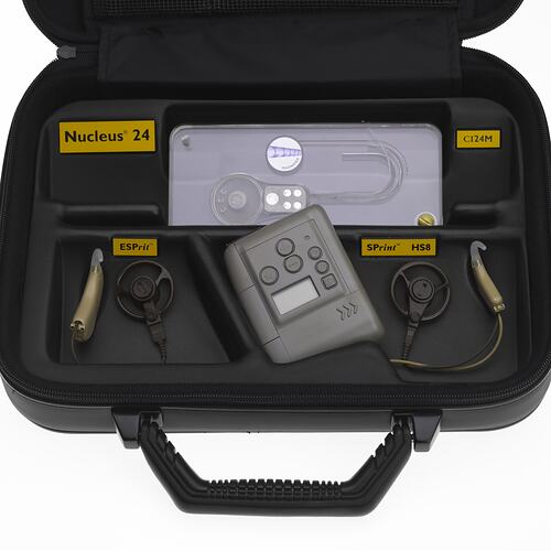 The Nucleus 24 cochlear implant system is made up of a C124M implant and a choice of either the Sprint body worn speech processor or the Esprit (world's first multi-channel ear level) speech processor. The C124M implant encased in a perspex block for display purposes, has strength and impact resistence of titanium case design. The base of the implant only requires one third of the drilling required for earlier models, making it easier to implant in infants and children. The electrode array fits around and delivers the desired current to the cochlea. The Espirt is powered by two hearing aid batteries lasting 80 hours. The fingertip control unit with two selectable programs optimises listening in different environments. Fits into black carry case.