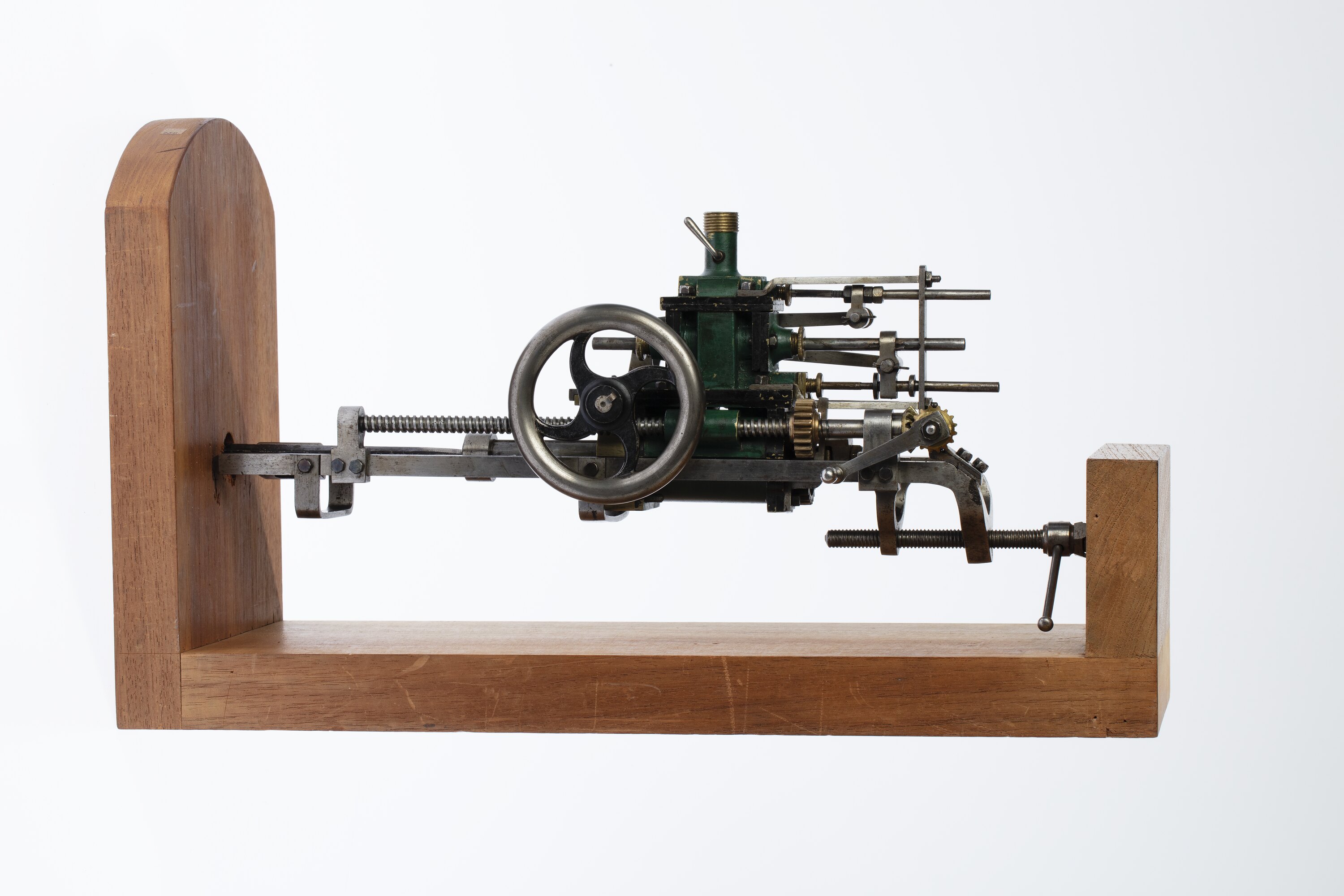 Model of a metal drill with working gears and pistons. The model has been bolted onto a wooden mount.