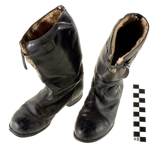 Pair of 1936 pattern black leather fleecy-lined flying boots. Used by George Rayner in Antarctica. Made by Bedggood Shoes Pty Ltd, Melbourne.