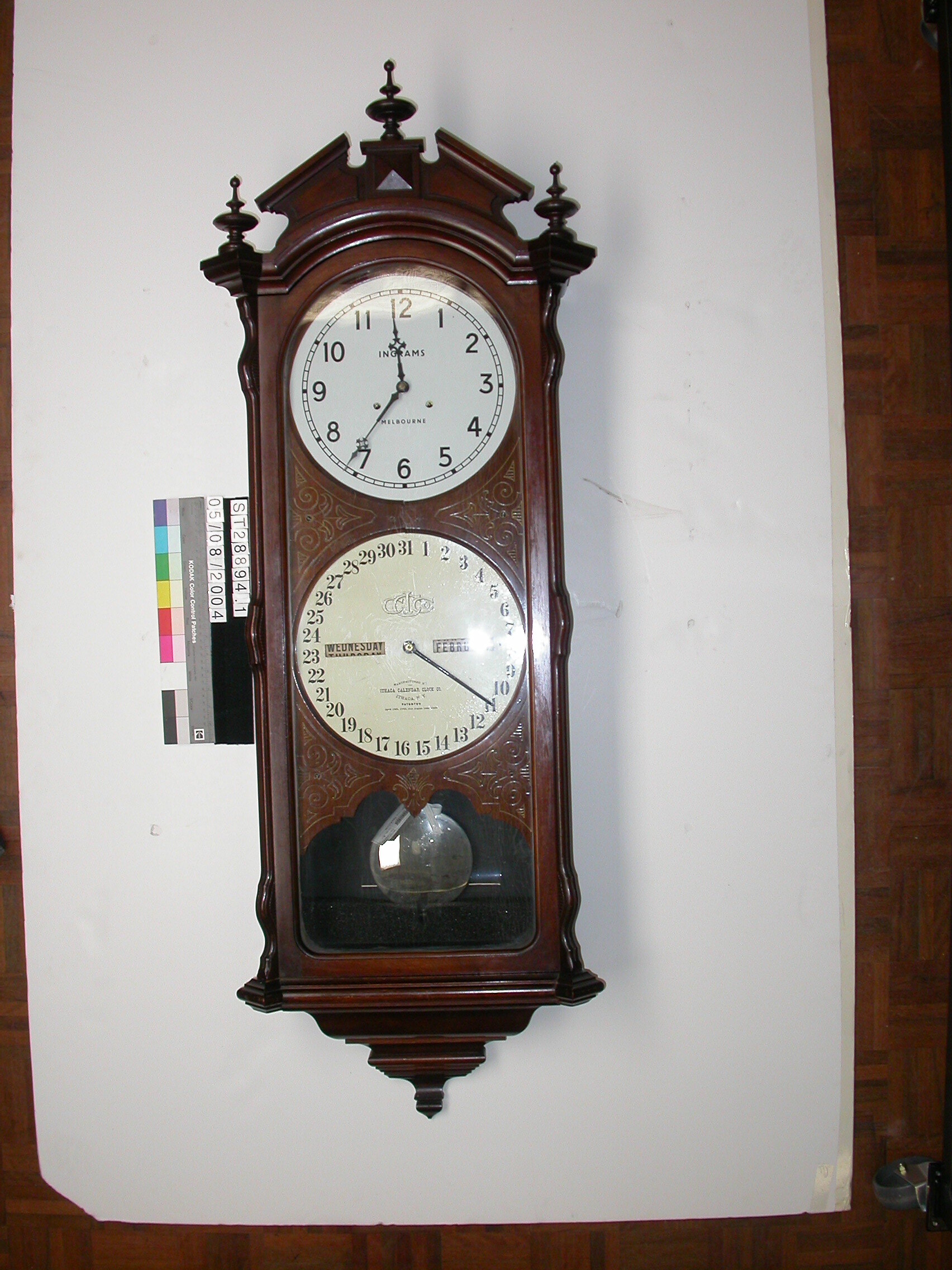 Upper dial is marked 'Ingrams Melbourne' and appears to be of a later date. Lower dial is marked 'I.C.C. Co' and 'Manufactured by Ithaca Calendar Clock Co, Ithaca, NY, patented April 18th 1865, August 28th 1866'.