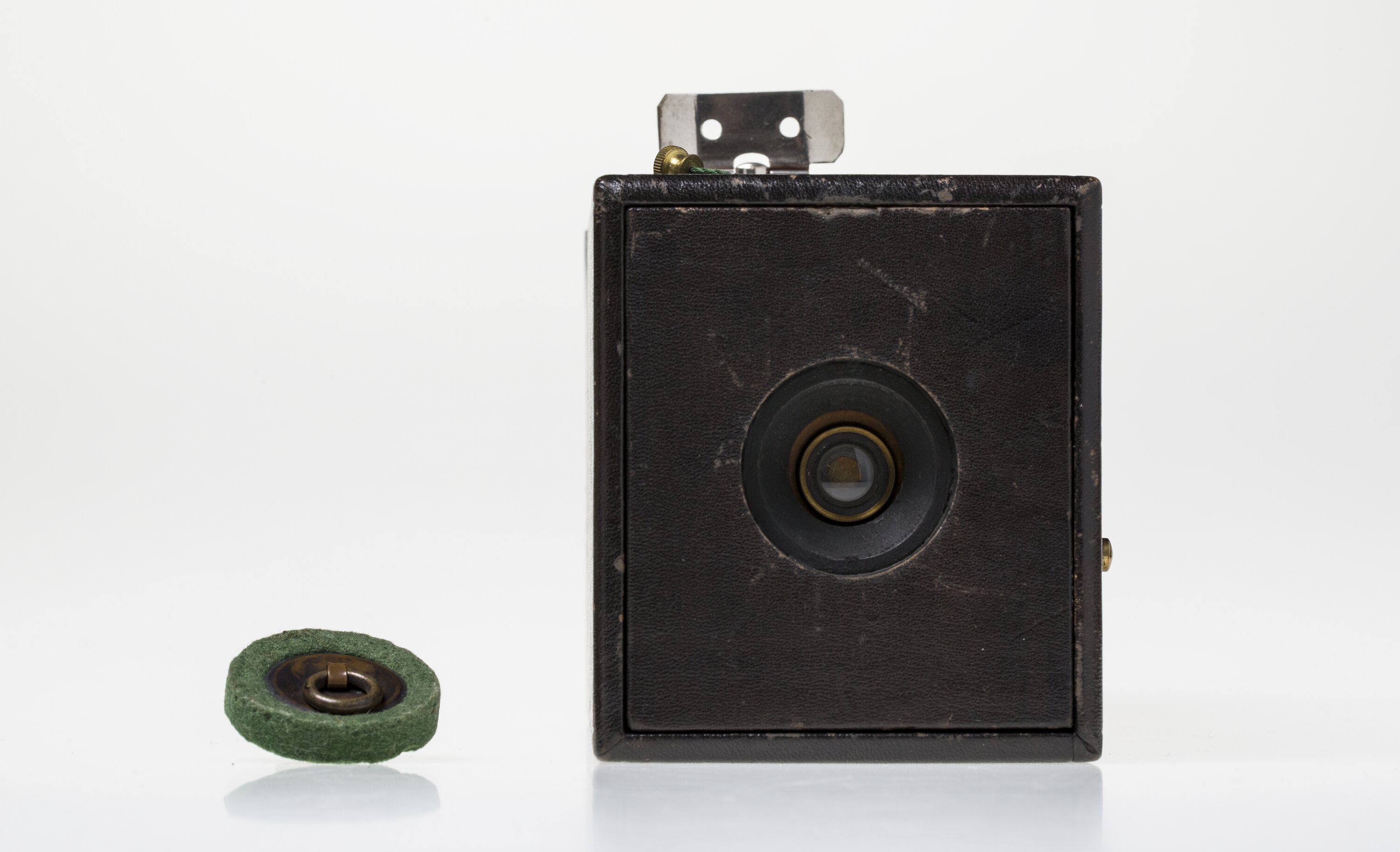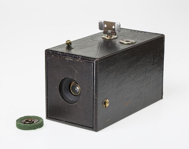 It was a landmark camera in the history of photography. It was the first camera to use roll film, George Eastman having taken out a patency on this type of roll film camera in 1888. Eastman first coined the name Kodak for that camera. This was a huge technological shift from the more cumbersome and professional equipment used in plate glass and plate film photography until then. The Kodak was inexpensive, easy to use, easy to carry and was immensely popular, so much so, that it made photography readily accessible to the everyday person. Eastman's motto: "You press the button, we do the rest." was coined with the arrival of this camera. Until then, photography was essentially the domain of the professional photographer both because of the complexities of the medium, the heavy equipment and the inherent cost. The Kodak was made of a leatherette-covered card box. It had a simple viewfinder and lens with a drawstring shutter mechanism and a metal film holder inside the body. It could take 100 pictures on one roll of film.